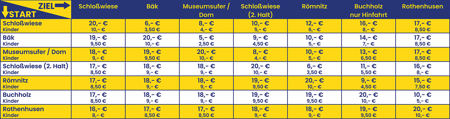 Alle Preise verstehen sich inkl. 7% Mehrwertsteuer (außer bei Charter- und Sonderfahrten)