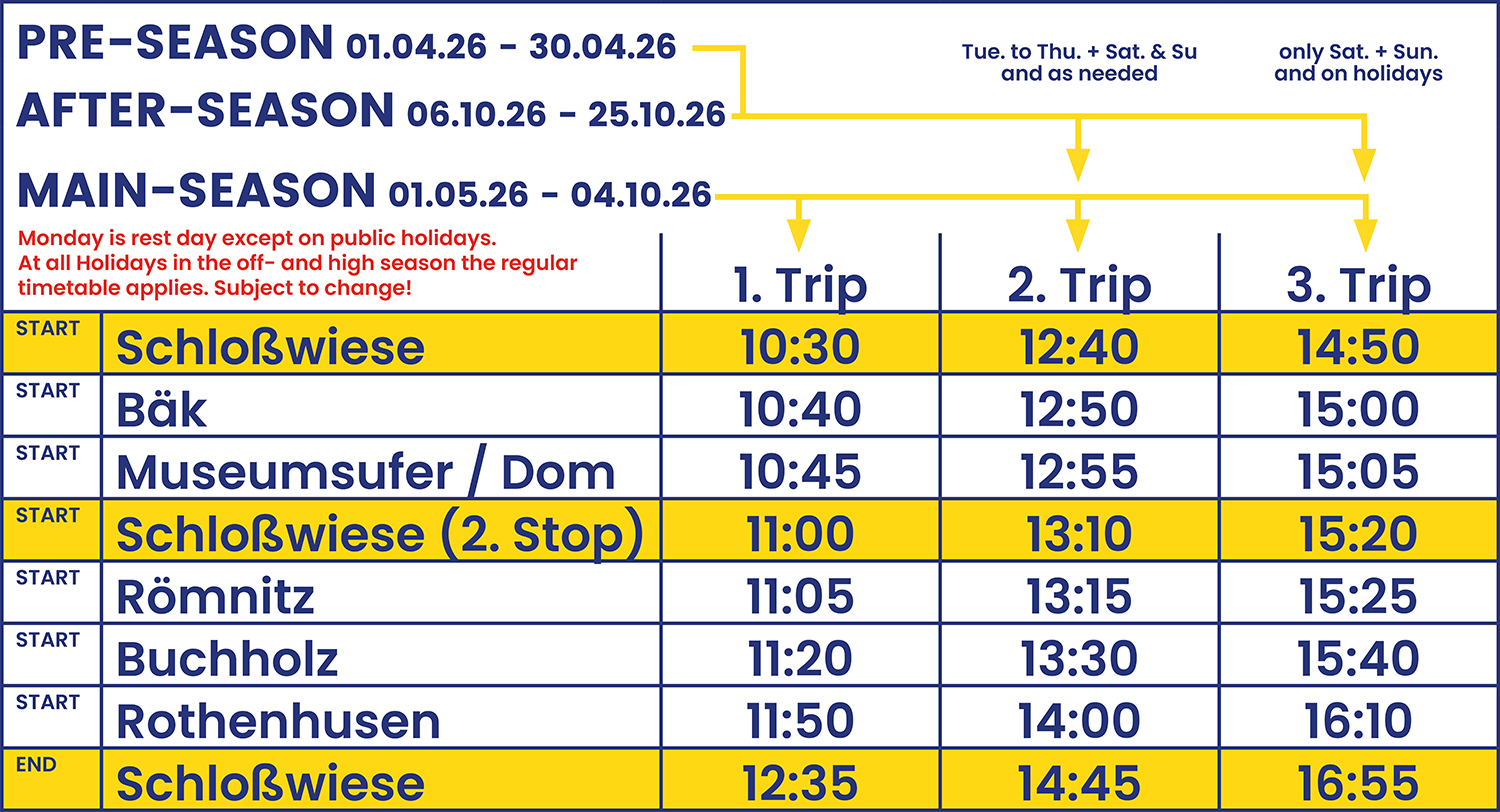 The medieval customs station Rothenhusen was fortified in 1595 by Lübeck directly at the outflow of the Ratzeburg lake to the Wakenitz and served as a defense against attacks by the dukes of Saxony-Lauenburg.In the pre-season (April 01, 2026 - April 30, 2026) and in the post-season (October 6, 2026 - October 25, 2026) the travel times change to: